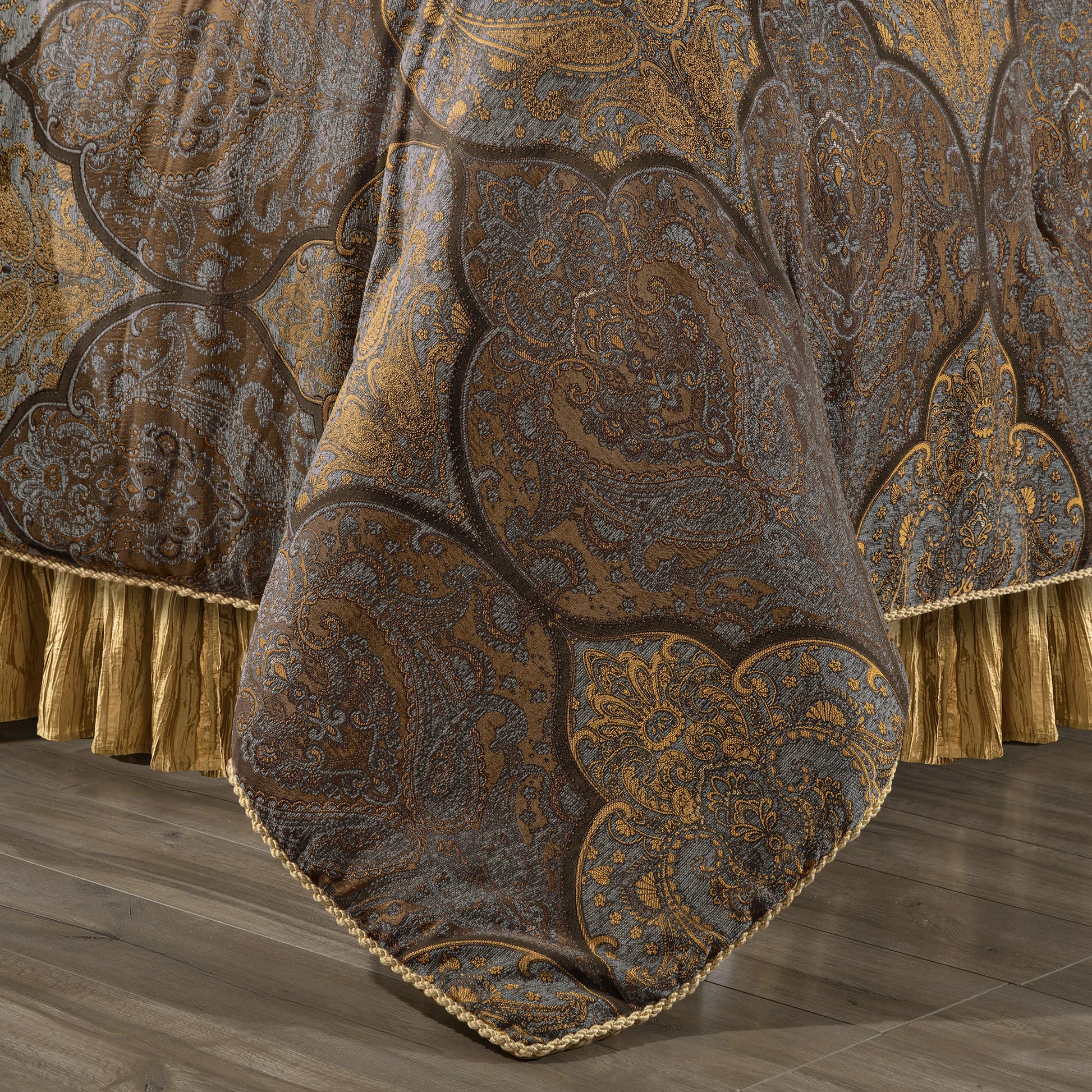 Featuring a classic antique style, this collection is crafted with an exquisite jacquard frame pattern in a soothing color combination of light gray blue, gold and brown. The luxurious decorative fringes and trims of the pillows add the finishing touch. With a soft drape and lofty weight, this bedding set will create a look and feeling of sophistication and tranquility in your bedroom.