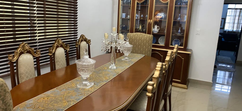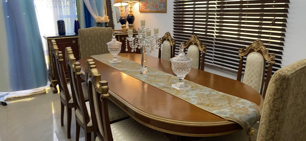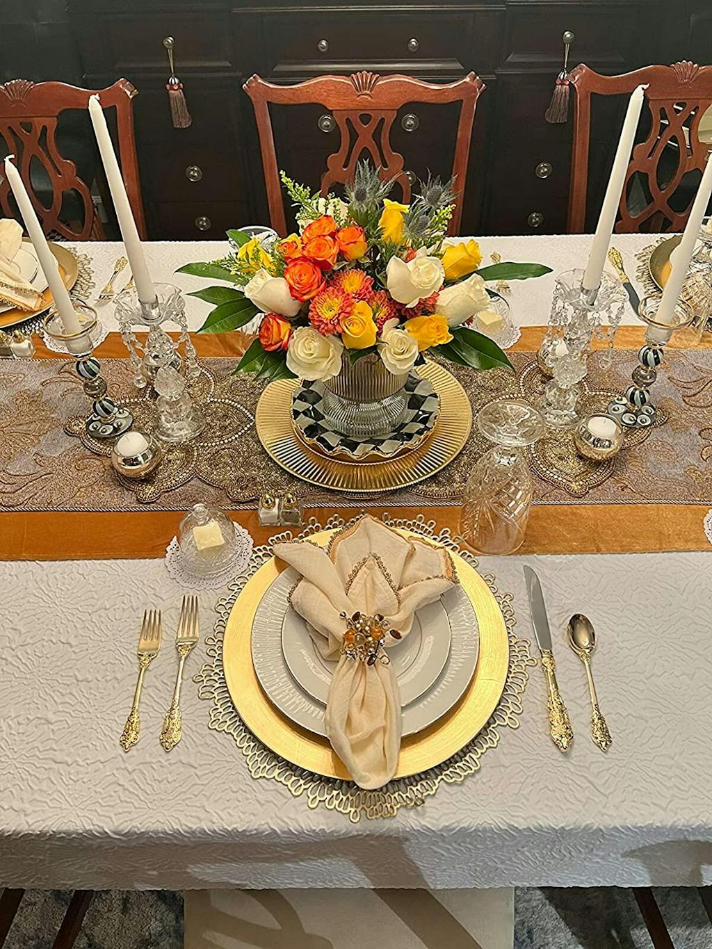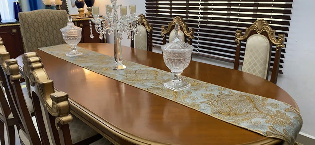 Transform your dining table with this unique style. Made with light gray blue chenille base fabric and enhanced with a gold retro large pattern, this table runner will add a timeless elegance to your table.