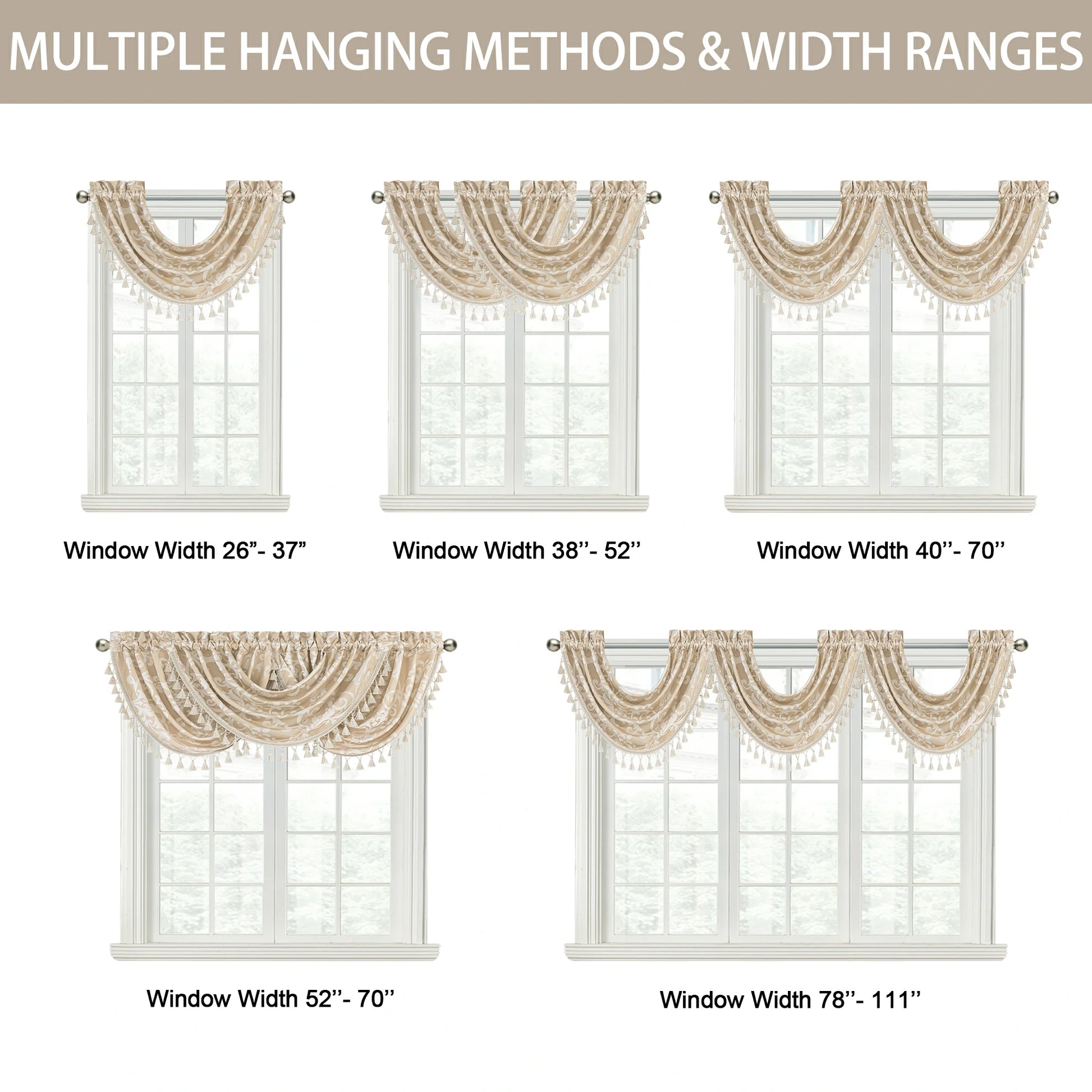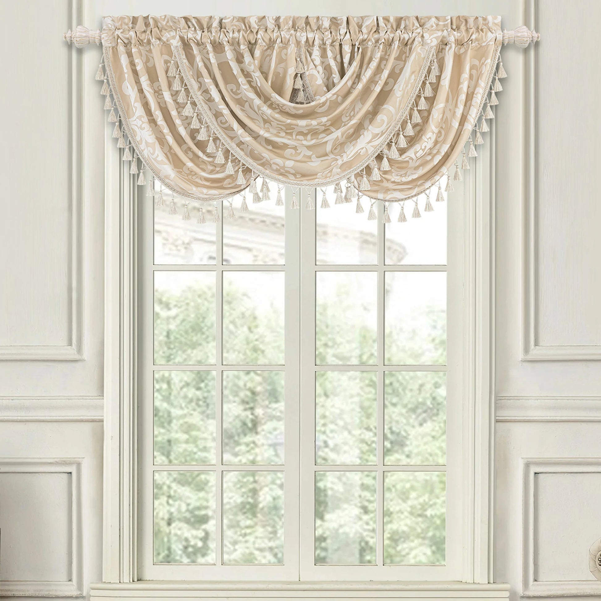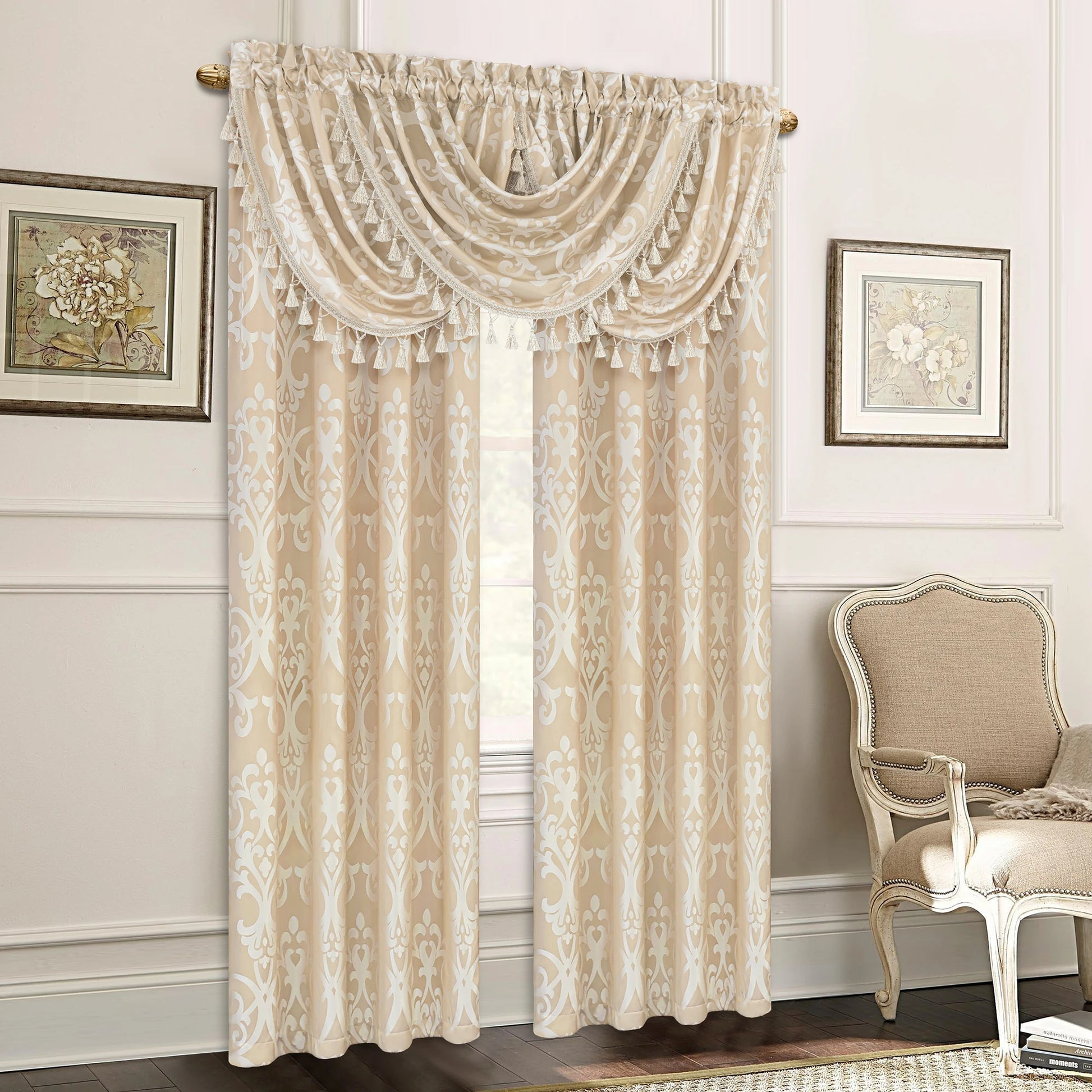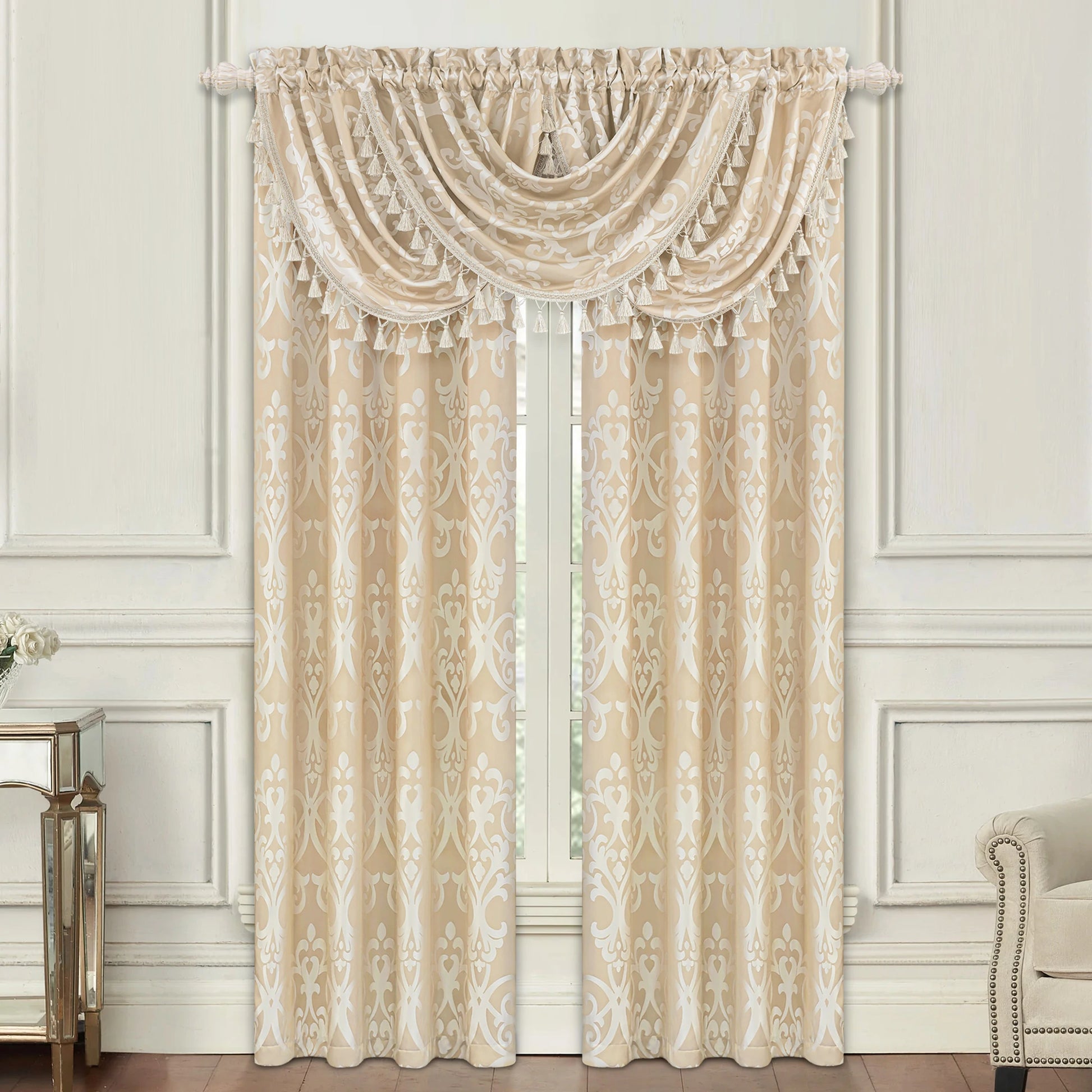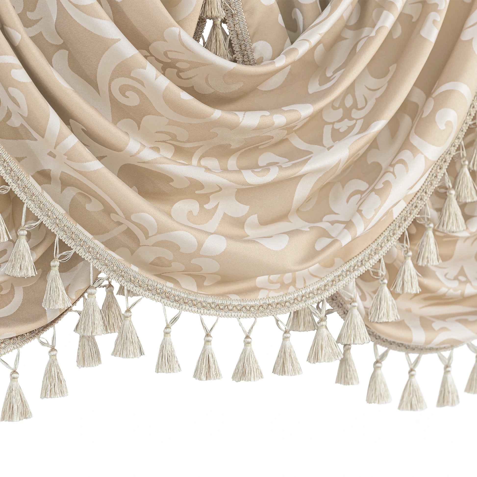 Swags crafted with a delicate European pattern design and beautiful use of a soft sand tone. Every detail is chosen to bring an air of elegance. Pair these valances with the coordinating curtains for a dramatic window treatment.
